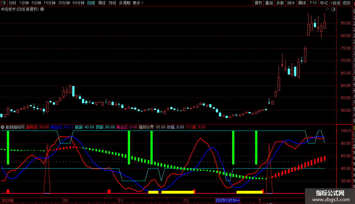 顶部:IF((趋势线-VAR6>85),80,100),COLORF0F000;