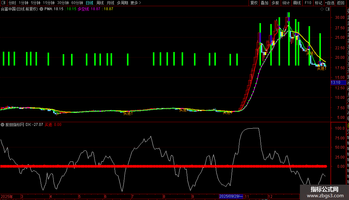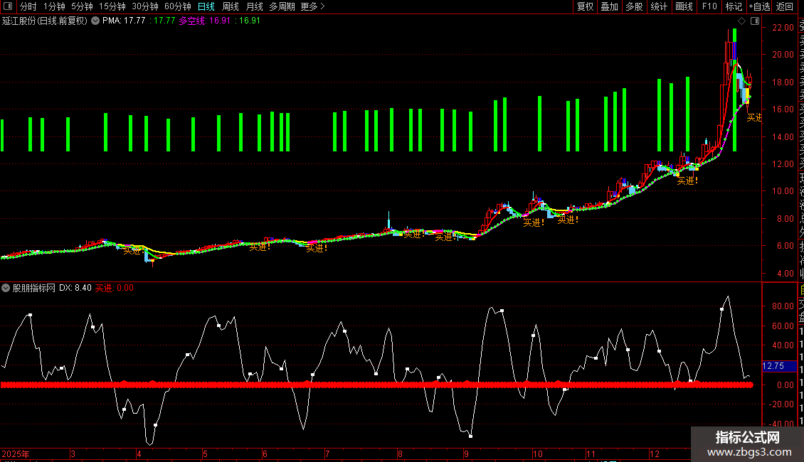 多空线:(20*X+19*REF(X,1)+18*REF(X,2)+17*REF(X,3)+16*REF(X,4)+15*REF(X,5)+14*REF(X,6)