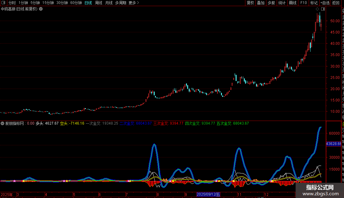 五次金叉:EMA((COUNT(VAR8,12)/12+COUNT(VAR7,12)/12+COUNT(VAR9,12)/12)/5*MA(多头,5)*2*6.8,5),COLOR10DD10,LINETHICK2;