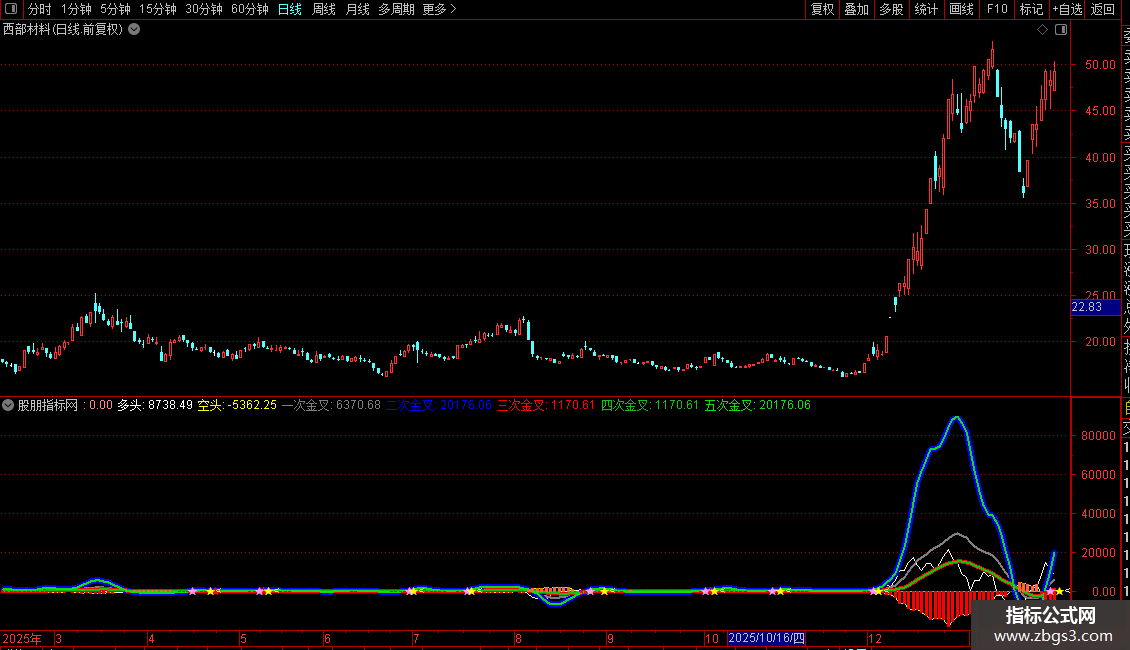 四次金叉:EMA((COUNT(VAR8,22)/22+COUNT(VAR7,22)/22+COUNT(VAR9,22)/22)/18*MA(多头,8)*5*1.8,5),COLOR10C110,LINETHICK2;