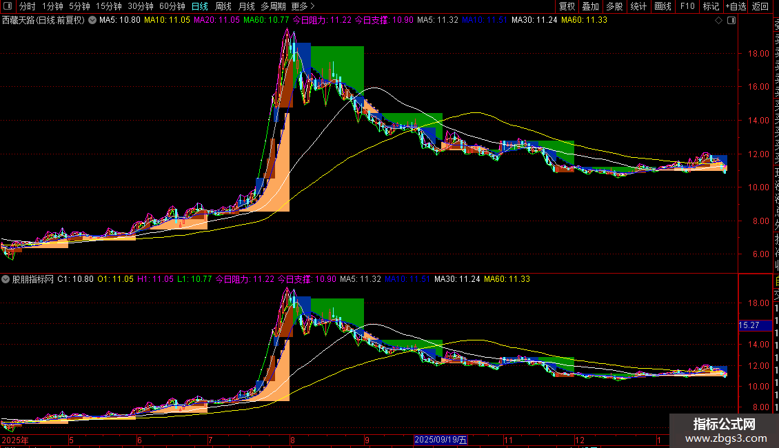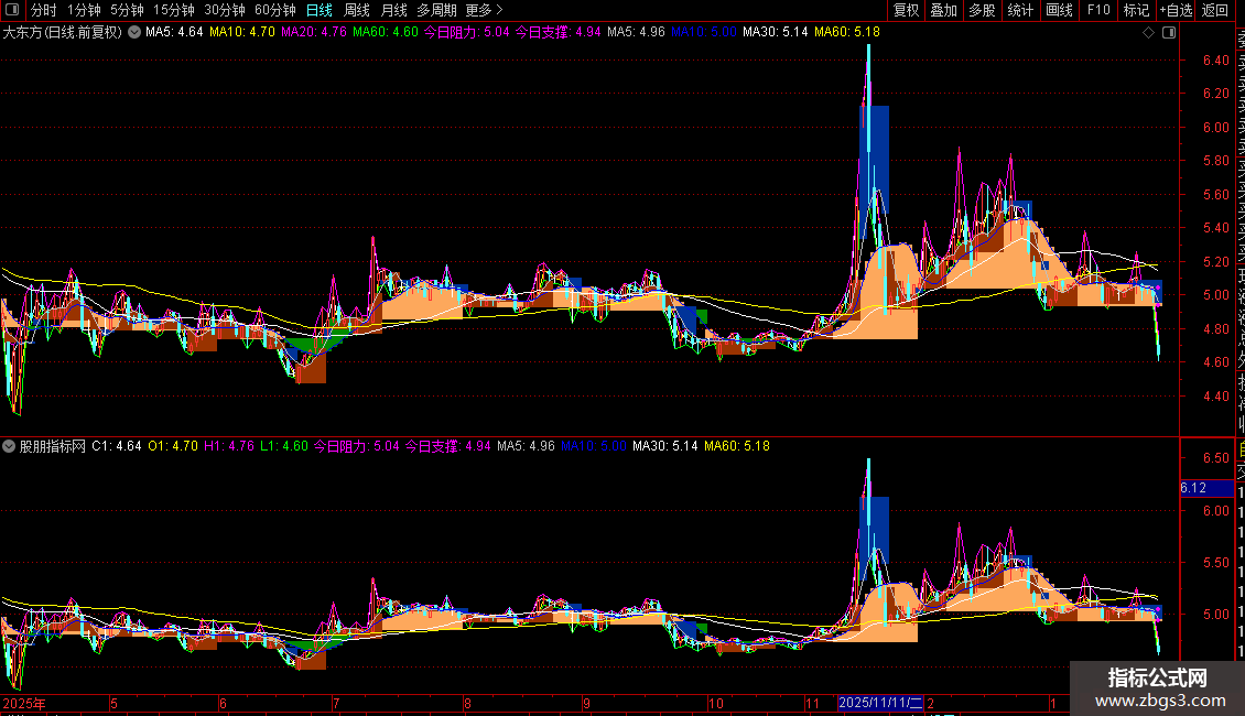 今日阻力:IF(ISLASTBAR,REF(明日阻力,1),DRAWNULL),POINTDOT,LINETHICK4,COLORMAGENTA;