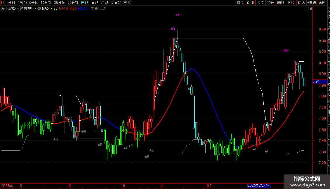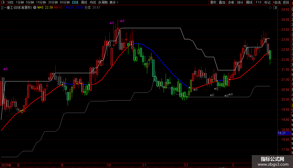A:=AMOUNT/V/100;VARA:=EMA((((A-EMA(A,13))/EMA(A,13))*(0-100)),5);操盘线:=EMA(((VARA/10)+EMA(A,10)),3);行情线:=EMA(A,3);重心:= (C+0.618*REF(C,1)+0.382*REF(C,2)+0.236*REF(C,3)+0.146*REF(C,4))/2.382;趋势线:EMA(((SLOPE(C,22)*20)+C),55),COLORYELLOW,LINETHICK2;红升:IF(重心>=趋势线,趋势线,DRAWNULL),COLORRED,LINETHICK2;蓝降:IF(重心<趋势线,趋势线,DRAWNULL),COLORBLUE,LINETHICK2;STICKLINE(行情线<操盘线,H,L,0,1),COLORGREEN;STICKLINE(行情线<操盘线,C,O,2,1),COLORGREEN;STICKLINE(行情线>=操盘线,H,L,0,1),COLORRED; STICKLINE(行情线>=操盘线,C,O,2,1),COLORRED;压力:MA(REF(HHV(C,30),1),2),COLORWHITE;支撑:MA(REF(LLV(C,30),1),2),COLORGRAY; DA:=(EMA(C,1)+EMA(C,2)+EMA(C,3)+EMA(C,4))/4;DB:= (EMA(C,10)+EMA(C,20)+EMA(C,40)+EMA(C,80))/4;DRAWTEXT(CROSS(DA- DB,0),L*0.98,'★B'),COLORGRAY;JH:=SMA(MAX(C-REF(C,1),0),5,1)/SMA(ABS(C- REF(C,1)),5,1)*100;DRAWTEXT(CROSS(84,JH),H*1.02,'☆S'),COLORMAGENTA;涨停:=IF((C-REF(C,1))*100/REF(C,1)>=(10-0.01*100/REF(C,1)),1,0); STICKLINE(涨停,O,C,2,0),COLORRED;跌停:=IF((REF(C,1)-C)*100/REF(C,1)>= (10-0.01*100/REF(C,1)),1,0);STICKLINE(跌停,O,C,2,1),COLORGREEN;