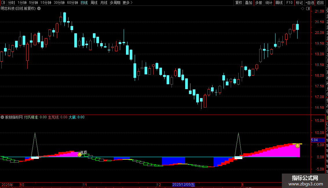 稳操胜券:STICKLINE(((VAR7 > REF(VAR7,1)) AND (VAR7 > 0)),0,VAR9,5,0),COLORFF00FF;