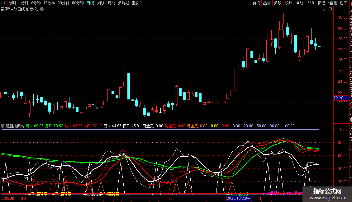 月金叉:IF(CROSS(月K,月D),20,0),COLOR0080FF;