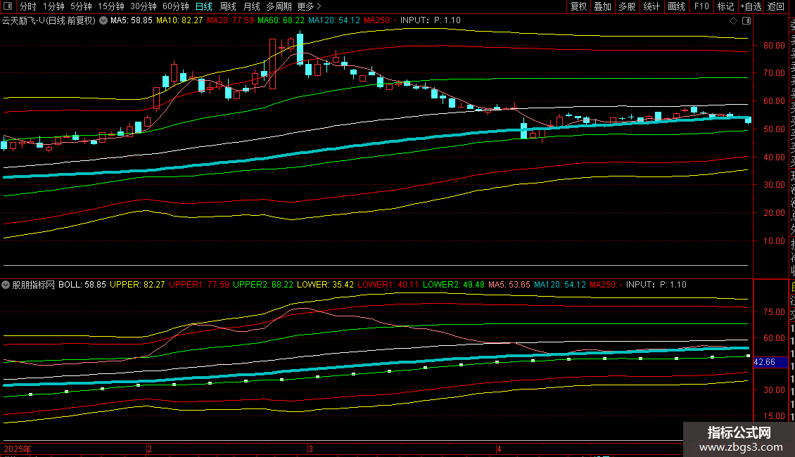 UPPER:BOLL+2.5*STD(C,P)COLORYELLOW;