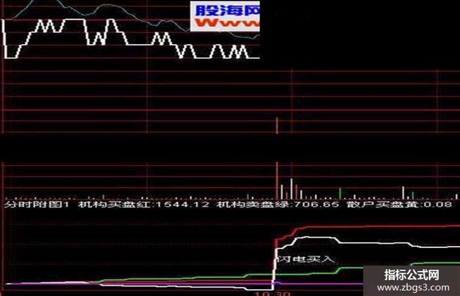 这是一个分时附图公式,与论坛里发的《新涨停王》异曲同工,只不过在公式里揉和了更具有明确性的指示---闪电买入),此公式最有效的使用时段在开盘后的45分钟,关注机构买入和卖出之比,两条线相距越大(机构买入红色在上)撞到涨停股的几率越大,抄底指示出现是用来辅佐判断机构买卖的,本公式主要用来关注机构大单趋势,好不好,靠自己判断及经验运用