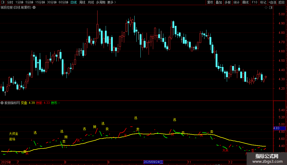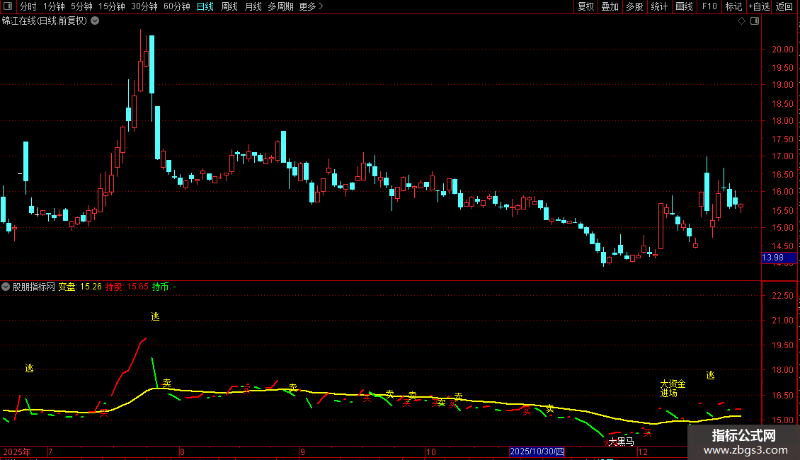 逃:当股价跌破关键“支撑”位且满足其他条件时,在K线高点标注“逃”字,提示紧急离场。