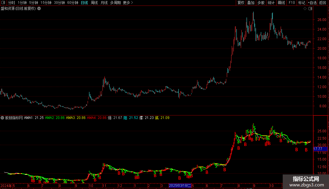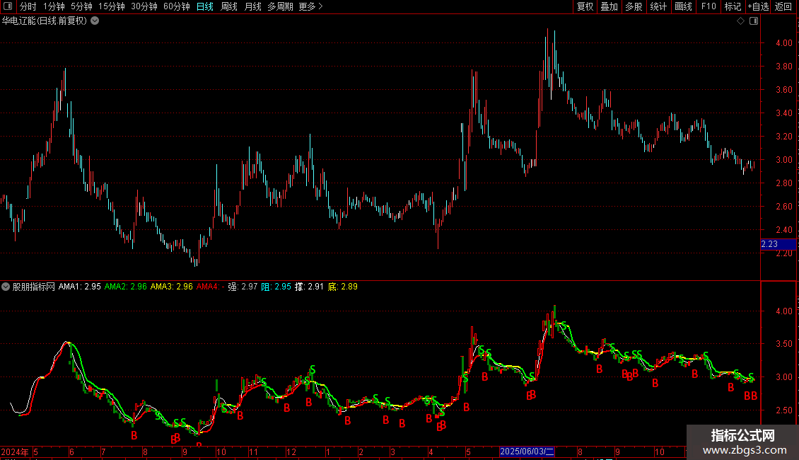 AMA3(黄色粗线):当AMA2较前一日走平(变化率>0.997)时显示,提示趋势可能进入盘整或面临变盘。