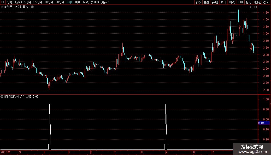 金牛出现: RR AND NOT(REF(RR,1)) AND (RR1<-100 AND BB1<-100) AND CB1<-100 AND VAR19=1;