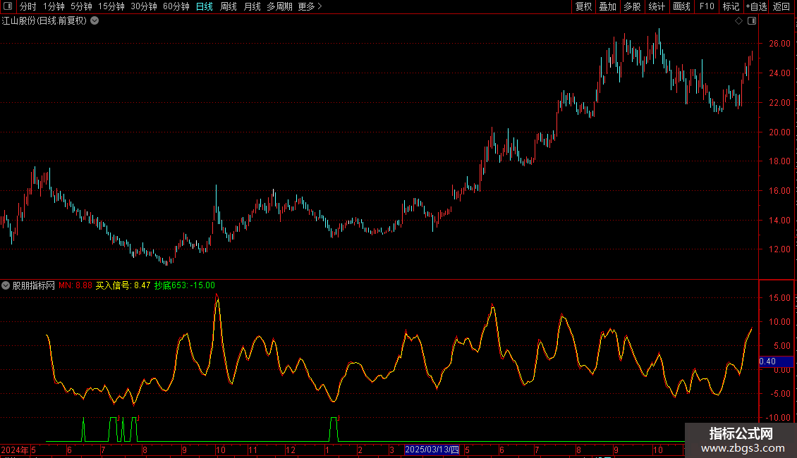 绿色抄底线:当 MN 值低于参数 P1(默认-6)时,在-10位置显示标记;否则在-15位置显示标记。
