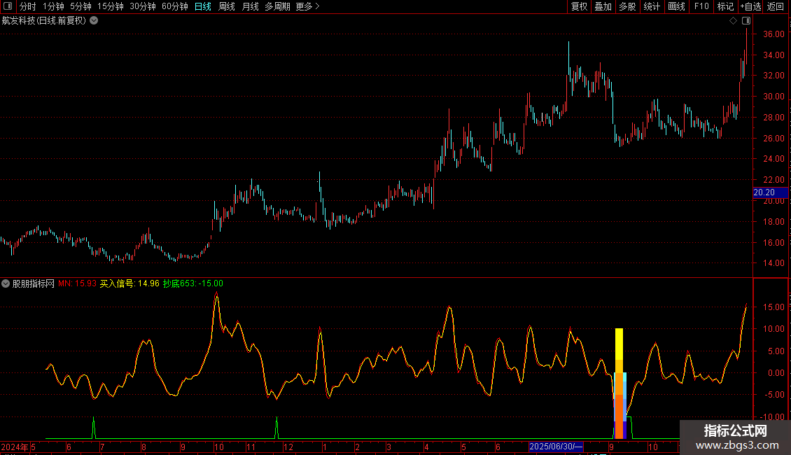 MN 线(红线)是核心,其数值越低代表股价偏离均线越远,超跌越严重。