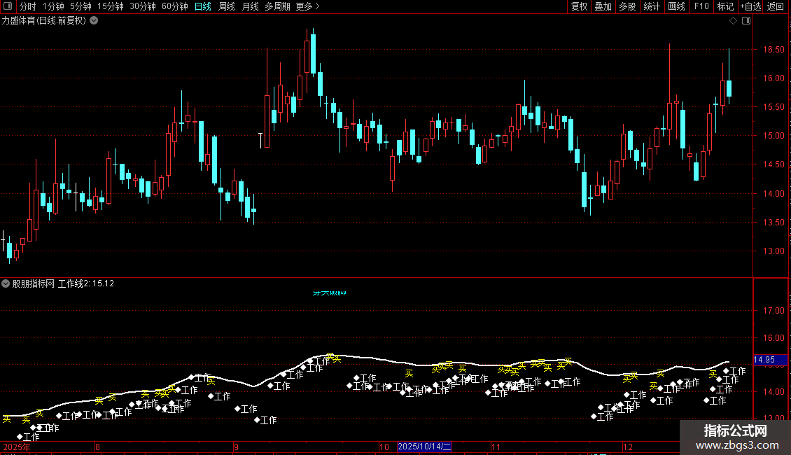 DRAWTEXT((工作线>=REF(工作线,1) AND 牛 AND L< 工作线 AND H>工作线) ,L*0.96 , '◆工作'),COLORWHITE;