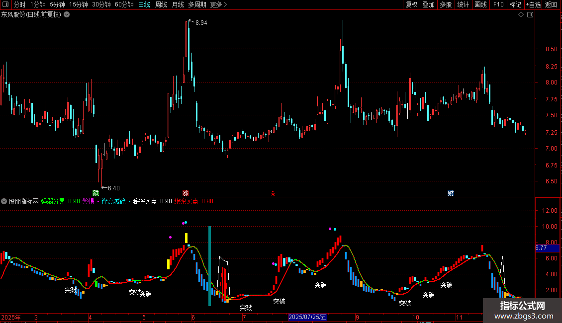 警惕:IF(CROSS(动力线1,警戒线1),量2+3,DRAWNULL),POINTDOT,LINETHICK5,COLORF00FF0;