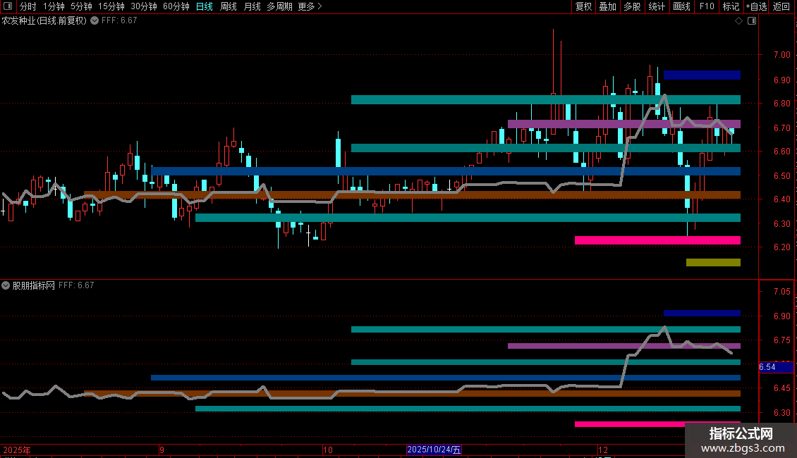 4. 在K线图上,以一条粗灰色水平线标出这个筹码最密集区域的价格中枢(`FFF`),有时还会用另一条线标出该密集区的边界(`FFF2`,但代码中未直接输出)。