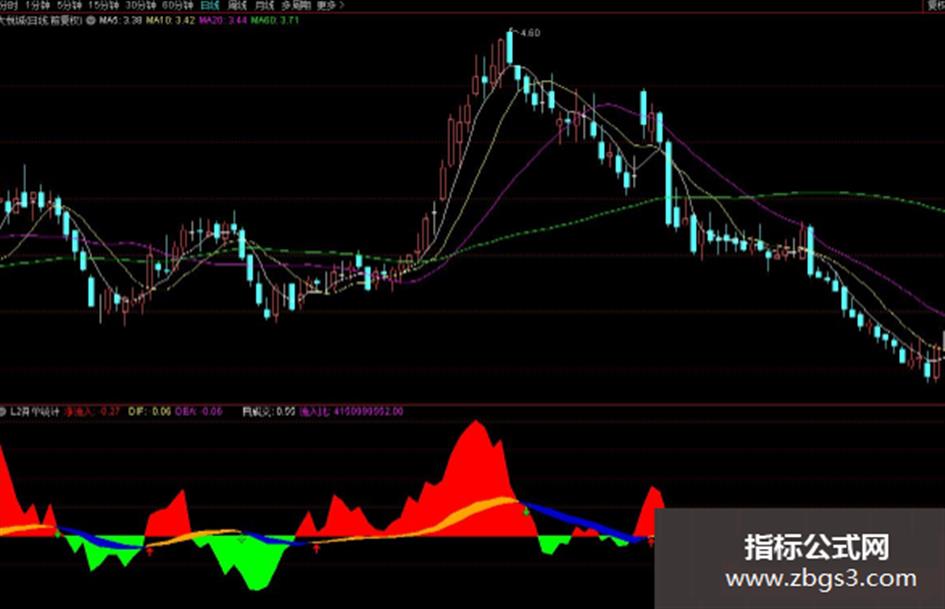 DRAWTEXT(DLB<-4.9 AND ZDFD>=5.9,净流入,'----跑'),COLORGREEN;