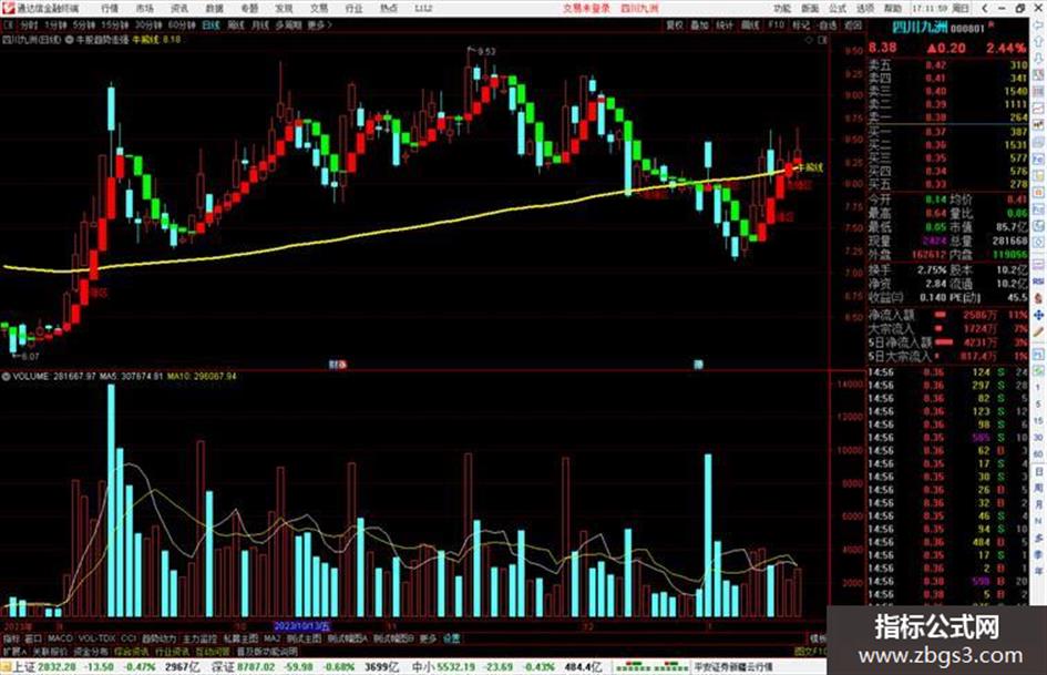 牛熊线:DMA(MA(CLOSE+REF(CLOSE,5)*XA1/CLOSE*0.098,90),vol),LINETHICK3,COLORYELLOW;