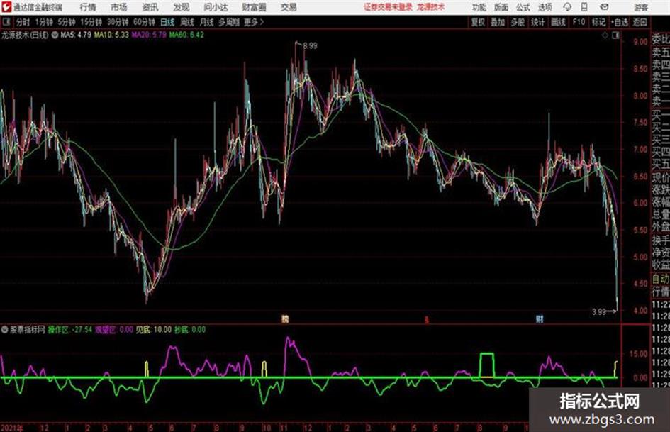 BIAS1:=MA((CLOSE-MA(CLOSE,13))/MA(CLOSE,13),3)*100,colorwhite;BIAS3:=MA((CLOSE-MA(CLOSE,27))/MA(CLOSE,27),3)*100,COLORFF00FF,LINETHICK2;操作区:IF(BIAS3<0,BIAS3,0),COLOR00EE00,LINETHICK2;观望区:IF(BIAS3>0,BIAS3,0),COLORFF00FF,LINETHICK2;见底:IF(BIAS3<-15,10,0),LINETHICK2,coloryellow;抄底:IF(COUNT(BIAS3<0,8)>=8 AND COUNT(BIAS3>0,34)>13 AND COUNT(BIAS3<0,55)>30,15,0),LINETHICK3;