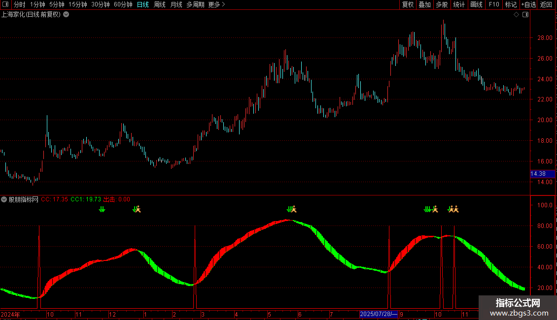 1. 绿色向下箭头(图标15):当CC1线由上向下死叉CC线时出现,是明确的趋势转弱或结束的警示信号。