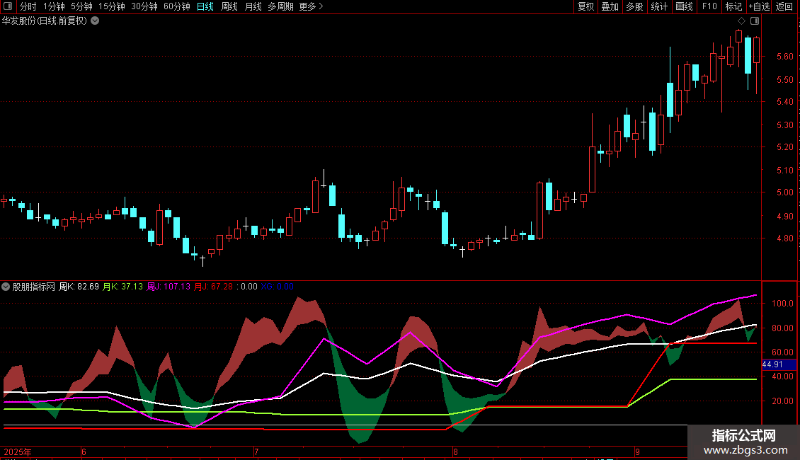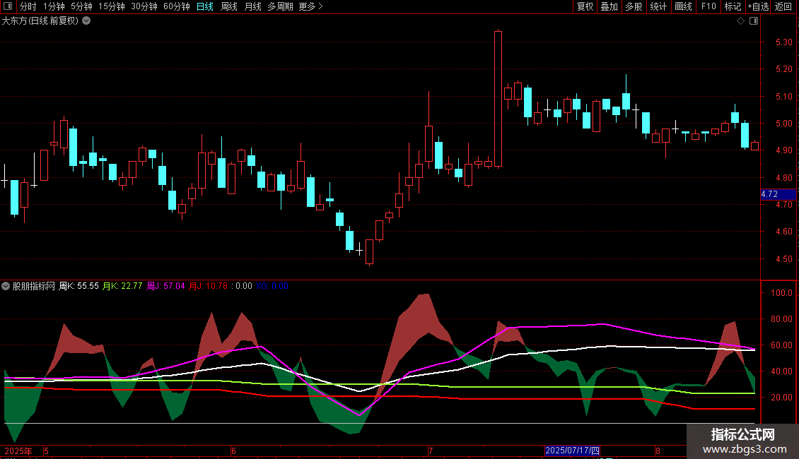 核心提示:这四条线代表中长期趋势的动量状态,其相互位置关系(如周J>周K、月J>月K)用于判断多空方向。