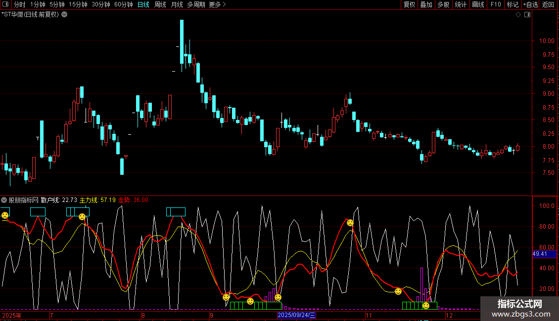 主力线:由KDJ指标的J值进行平滑(6日EMA)得到,代表主力资金的动向。通常为黄色曲线。