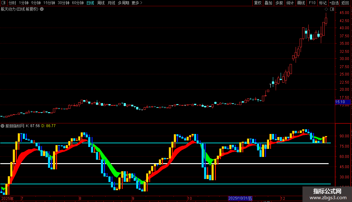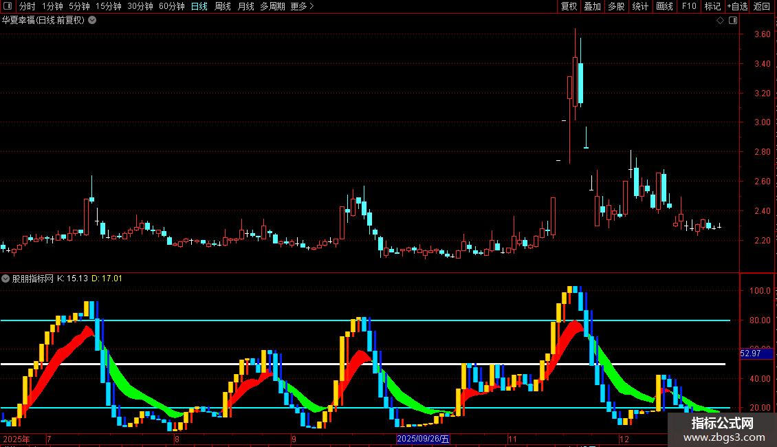 1. 背景参考线:在副图区域80、50、20三个关键位置绘制了三条粗线,作为超买、中轴和超卖的视觉参考。