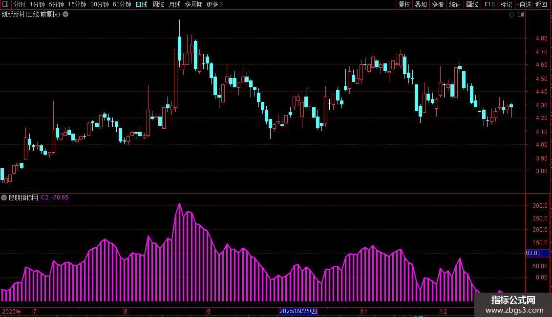 3. 柱状图:当 `C2` 指标线的数值 大于 “强势区”(-100)时,在 `C2` 线与-100线之间会绘制 粉色(COLORFF00FF)的柱状线。柱状线的长度直观地显示了 `C2` 值超出-100阈值的幅度。这有助于可视化“处于强势区域之上”的状态。