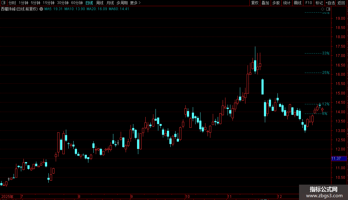 3. 关键涨幅线绘制:以该阶段性低点的价格为基准,自动计算出上涨8%、12%、25%、33%、50%等关键位置的价格。在主图上,从阶段性低点位置向右画出这些价格对应的水平虚线(颜色为COLORAAAA11),并延伸至最新K线位置。在图形最右侧,会标注每条线对应的涨幅百分比(如“8%”、“50%”)。