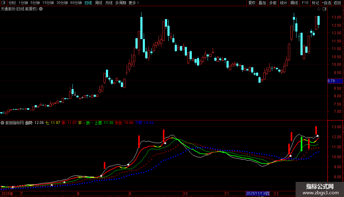趋势:FORCAST(C,13),COLORFFFFFF,LINETHICK1;