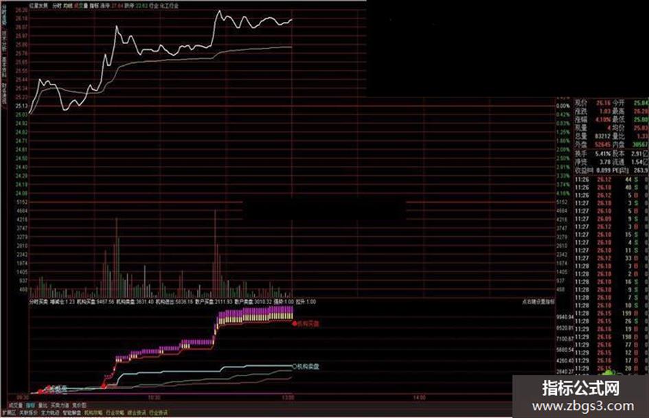 细红线为散户买盘,细绿线为散户卖盘。 粗红线为机构买盘,粗兰线为机构卖盘。 机构买盘出现或机构买盘上穿机构卖盘时出现红字“●机买”。 机构卖盘出现或机构卖盘上穿机构买盘时出现兰字“○机卖”。 “●机构买盘”、“○机构卖盘”会一直伴随两条线至收盘。 机构买盘强势用黄柱显示,机构买盘拉升用紫柱显示。