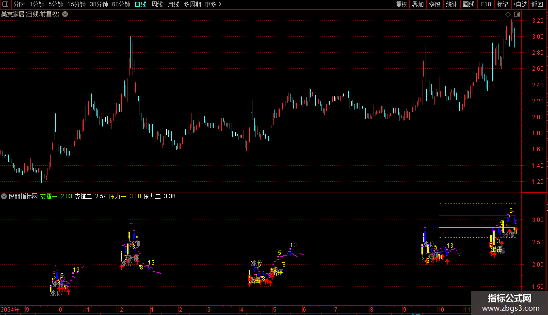 {支撑三:IF(CURRBARSCOUNT<=50,ZC3,DRAWNULL),COLORWHITE,POINTDOT;}