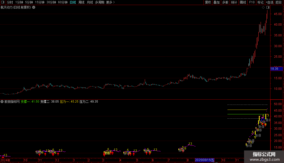 支撑一:IF(CURRBARSCOUNT<=50,ZC1,DRAWNULL),COLOR00F24F;