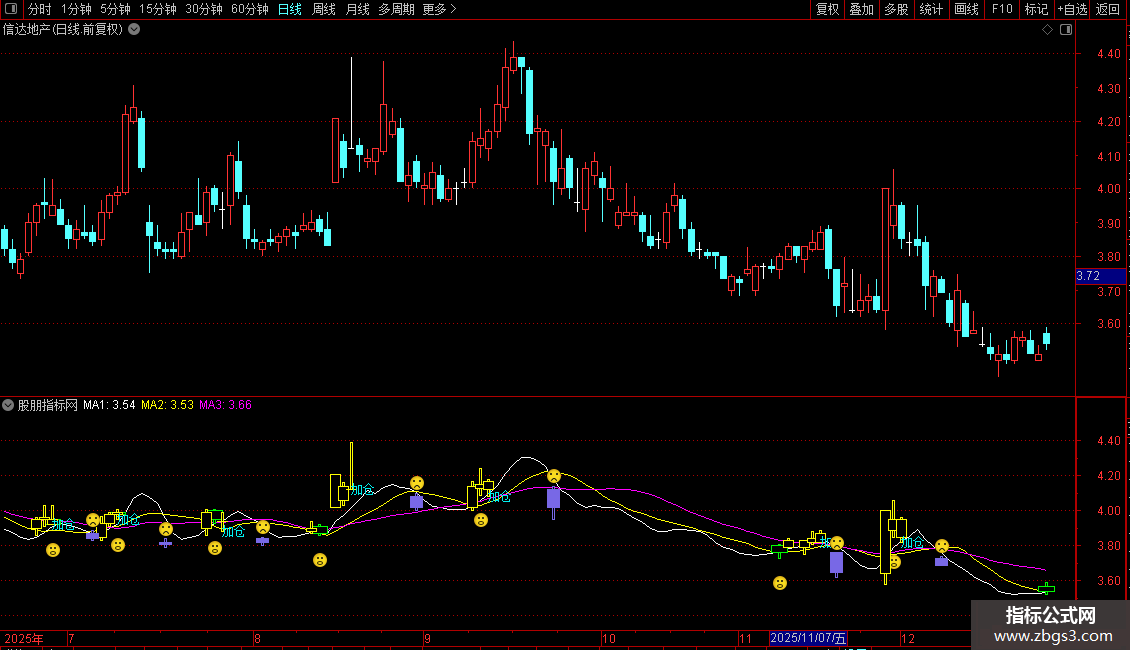DRAWTEXT(COUNT(CLOSE>MA3,3)=3 AND REF(CLOSE,3)<REF( REF(MA3,3),1),LOW,'加仓'),COLORF0F000;