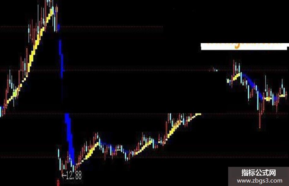 N:=IF(BARSCOUNT(C)>=10,10,BARSCOUNT(C)); STICKLINE(C>=MA(C,N),MA(C,N),MA(C,N*0.7),4,0),COLORYELLOW; STICKLINE(C<MA(C,N),MA(C,N),MA(C,N*0.7),4,0),COLORBLUE; DRAWKLINE(H,O,L,C);