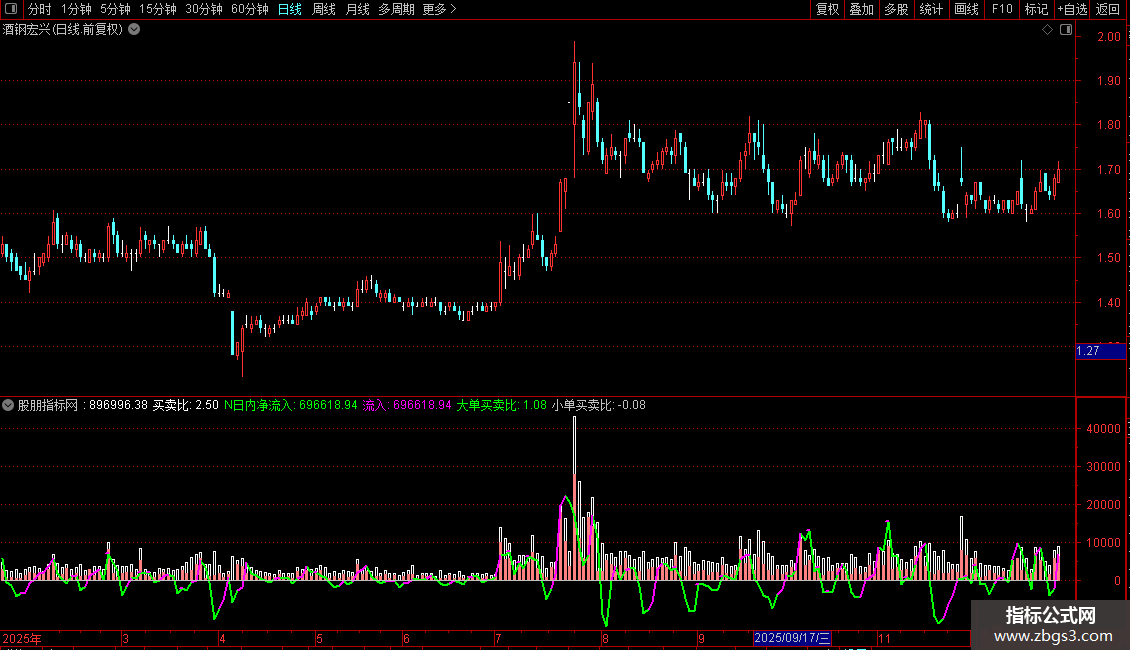 买:=IF(CLOSE>OPEN,VAR1*(HIGH-LOW),IF(CLOSE<OPEN,VAR1*((HIGH-OPEN)+(CLOSE-LOW)),VOL/2)),COLORRED;