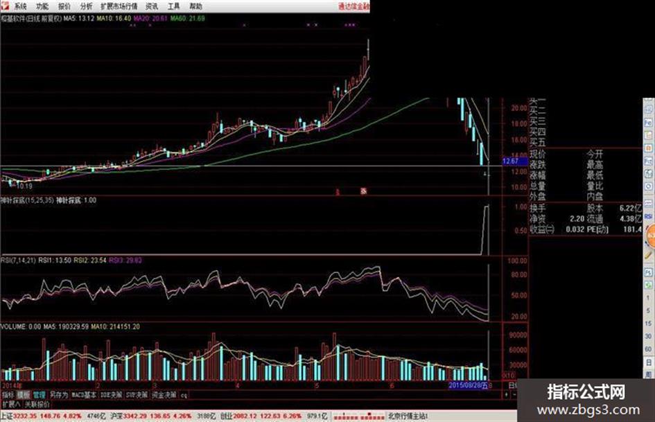 "探底神针"RSI指标具体应用步骤如下: 1、需要将RSI指标的N参数分别设置为7日、14日、21日。 2、当股价经过大幅度的调整走势后,密切观察探底神针"RSI"指标的见底信号,要求7日RSI必须小于10、14日RSI指标必须小于20、21日RSI指标必须小于30。 3、当RSI指标达到上述标准后,如果股价继续下跌,而RSI指标出现明显止跌信号,并与股价走势背离,则需重点关注。 4、如果RSI指标出现7日线上穿14日线和14日线上穿21日线的黄金交叉,并且RSI三线呈现出多头排列,表明RSI指标已经完成了买入信号的提示作用。 5、观察成交量变化。当RSI指标符合上述技术要求时,投资者需要观察成交量的动向。对于成交量的观察有两种:一种是当RSI出现上述技术特征时,成交量是否极度萎缩,甚至出现地量水平。如果成交稀少,则表明该股即将完成探底,投资者可以积极介入。 另一种量能观察是当该股完成探底,投资者及时介入后,则需要观察该股能否出现有实质性增量资金介入的放量过程,如果不能有效放量,则说明目前的底部仍是阶段性底部,投资者需要以短线反弹行情对待。如果该股探底成功后,量能有效持续性地放大,则投资者可以将其视为个股的重要底部,并坚定持股。