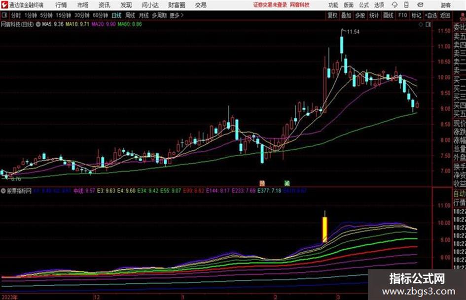 中线: (MA(CLOSE,3) + MA(CLOSE,6) + MA(CLOSE,12) + MA(CLOSE,24))/4,COLORMAGENTA;