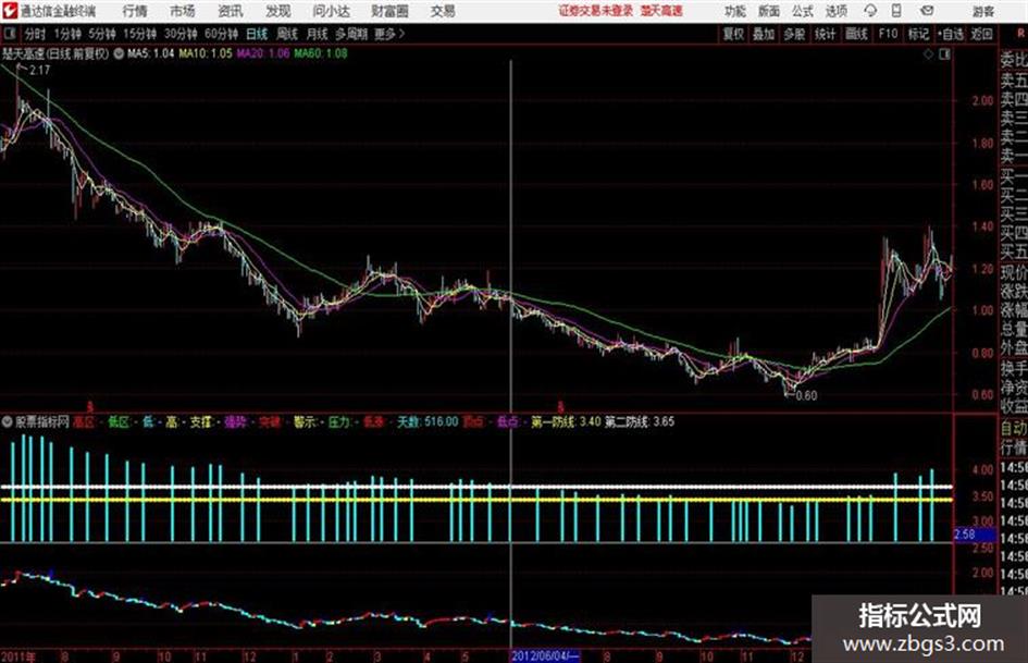 当满足条件到最后交易的周期<=N/2时,在支撑和支撑位置之间画柱状线,宽度为2,0不为0则画空心柱.,COLORFF00FF