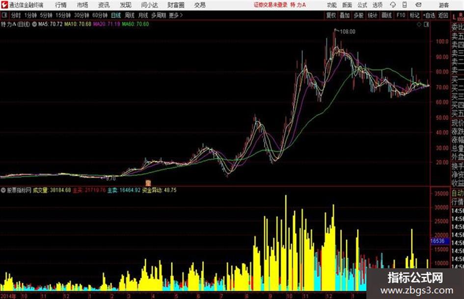 主卖:IF(CLOSE>OPEN,AA*((HIGH-CLOSE)+(OPEN-LOW)),IF(CLOSE<OPEN,AA*(HIGH-LOW),VOL /2)),COLORCYAN,POINTDOT;