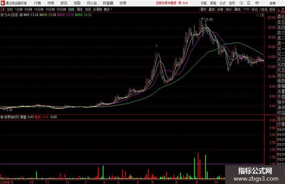 STICKLINE(盈亏筹码<0 AND 穿透>4,0,穿透,1,0),COLORBLUE;