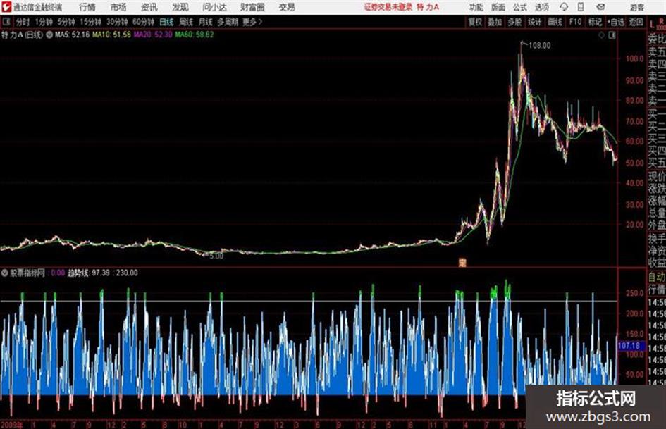 STICKLINE((趋势线 >230 ),250,趋势线,0.8,1),LINETHICK6,COLORGREEN;