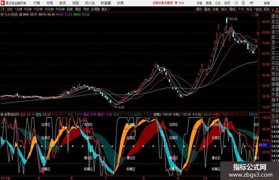 短期赋值:100*(收盘价-5日内最低价的最低值)/(5日内收盘价的最高值-5日内最低价的最低值),画白色,线宽为2