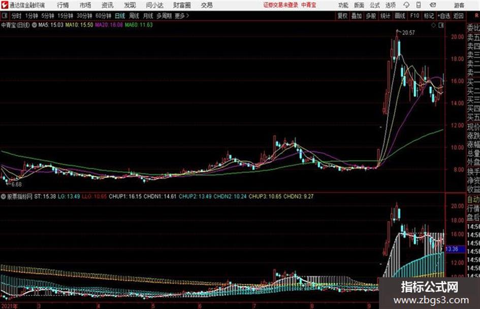 A:=(CLOSE+OPEN+LOW+HIGH)/4;K1:=EMA(A,3),colorblue;K2:=EMA(A,5),colorblue;K3:=EMA(A,8),colorblue;K4:=EMA(A,10),colorblue;K5:=EMA(A,12),colorblue;K6:=EMA(A,15),colorblue;K7:=EMA(A,30),coloryellow;K8:=EMA(A,35),coloryellow;K9:=EMA(A,40),coloryellow;K10:=EMA(A,45),coloryellow;K11:=EMA(A,50),coloryellow;K12:=EMA(A,60),coloryellow;K13:=EMA(A,120),colorcyan;K14:=EMA(A,140),colorcyan;K15:=EMA(A,160),colorcyan;K16:=EMA(A,180),colorcyan;K17:=EMA(A,200),colorcyan;K18:=EMA(A,220),colorcyan;ST:(K1+K2+K3+K4+K5+K6)/6,colorwhite,LINETHICK2;LG:(K7+K8+K9+K10+K11+K12)/6,colorcyan,LINETHICK2;LLG:(K13+K14+K15+K16+K17+K18)/6,colorred,LINETHICK2;CHUP1:HHV(ST,20),colorwhite,DOTLINE;CHDN1:LLV(ST,20),colorwhite,DOTLINE;CHUP2:HHV(LG,20),colorcyan,DOTLINE;CHDN2:LLV(LG,20),colorcyan,DOTLINE;CHUP3:HHV(LLG,20),coloryellow,DOTLINE;CHDN3:LLV(LLG,20),coloryellow,DOTLINE;STICKLINE(CHUP1>REF(CHUP1,1) OR (CHUP1=REF(CHUP1,1) AND CHDN1>REF(CHDN1,1)),CHUP1,CHDN1,0.3,1),colorwhite;STICKLINE(CHUP1<REF(CHUP1,1) OR (CHUP1=REF(CHUP1,1) AND CHDN1<REF(CHDN1,1)),CHUP1,CHDN1,0.3,-1),colorwhite;STICKLINE(CHUP2>REF(CHUP2,1) OR (CHUP2=REF(CHUP2,1) AND CHDN2>REF(CHDN2,1)),CHUP2,CHDN2,0.3,1),colorcyan;STICKLINE(CHUP2<REF(CHUP2,1) OR (CHUP2=REF(CHUP2,1) AND CHDN2<REF(CHDN2,1)),CHUP2,CHDN2,0.3,-1),colorcyan;STICKLINE(CHUP3>REF(CHUP3,1) OR (CHUP3=REF(CHUP3,1) AND CHDN3>REF(CHDN3,1)),CHUP3,CHDN3,0.3,1),coloryellow;STICKLINE(CHUP3<REF(CHUP3,1) OR (CHUP3=REF(CHUP3,1) AND CHDN2<REF(CHDN2,1)),CHUP3,CHDN3,0.3,-1),coloryellow;DRAWKLINE(H,O,L,C);