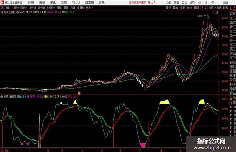 买2:IF(CROSS(风险,慢线) AND 慢线>REF(慢线,1) AND K>REF(K,1) AND 慢线<60,70,0),NODRAW,COLORRED;