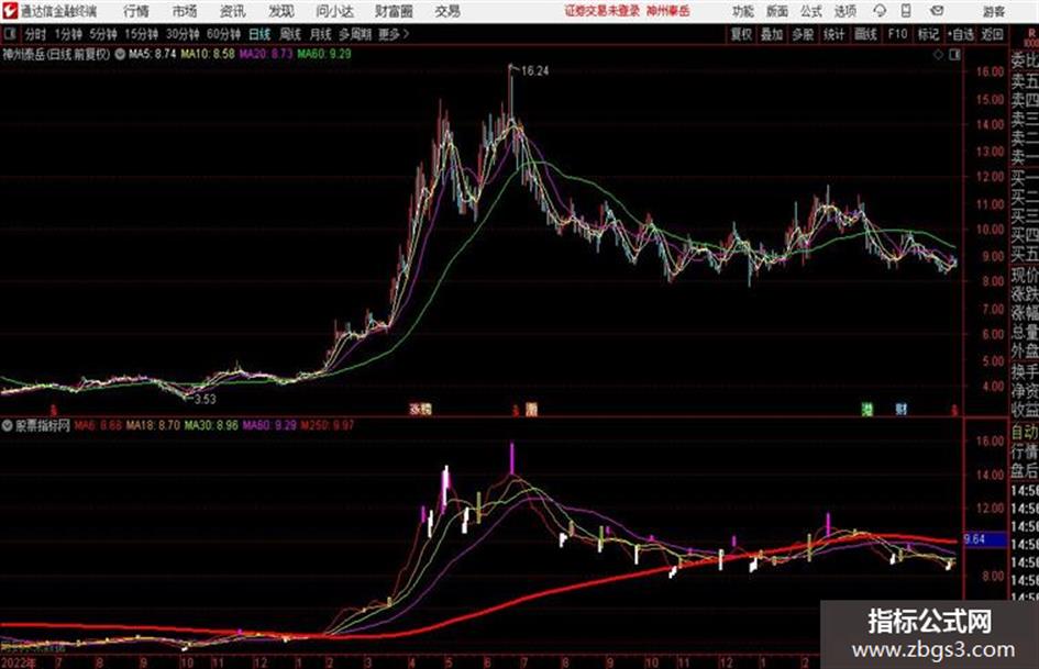 MA6:MA(C,6),COLOR0000FF;MA18:MA(C,18),COLOR0096FF;MA30:MA(C,30),COLOR00FF99;MA60:MA(C,60),COLORFF00FF;M250:MA(C,250),COLORRED,LINETHICK3;LC:=REF(CLOSE,1);RSI:=SMA(MAX(CLOSE-LC,0),4,1)/SMA(ABS(CLOSE-LC),4,1)*100;VAR27:=REF(CLOSE,1);VAR28:=SMA(MAX(CLOSE-VAR27,0),5,1)/SMA(ABS(CLOSE-VAR27),6,1)*100;VARA:=((AMOUNT)/(VOL))/(100);VARB:=((3)*(HIGH)+LOW+OPEN+(2)*(CLOSE))/(7);VARC:=((SUM(AMOUNT,7))/(VARA))/(100);VARD:=DMA(VARB,(VOL)/(VARC));VARE:=((CLOSE-VARD)/(VARD))*(100);VARF:=((CLOSE-LLV(LOW,34))/(HHV(HIGH,34)-LLV(LOW,34)))*(100);VARJ:=MA(VARE,20)+STD(VARE,20);VARH:=(C+L+H)/3;VARL:=EMA(VARH,6);VARG:=EMA(VARL,5);BIAS18:=((CLOSE-MA(CLOSE,18))/(MA(CLOSE,18)))*(100);AA:=SMA(VARF,3,1);VAR1:=ZIG(3,10)< REF(ZIG(3,10),1) AND REF(ZIG(3,10),1)>REF(ZIG(3,10),2);VAR2:=ZIG(3,10)>REF(ZIG(3,10),1) AND REF(ZIG(3,10),1)< REF(ZIG(3,10),5);STICKLINE(VAR1,H,L,8/4,0),COLORFF00FF,LINETHICK2;STICKLINE(VAR1,H,L,13/4,0),COLORGREEN,LINETHICK2;STICKLINE(VAR1,H,L,1/4,0),COLORFF00FF,LINETHICK2;STICKLINE(VAR2,H,L,13/4,0),COLORWHITE,LINETHICK2;STICKLINE(VAR2,H,L,3/4,0),COLORWHITE,LINETHICK2;STICKLINE(CROSS(VARL,VARG),H,L,2/4,1),COLORYELLOW;