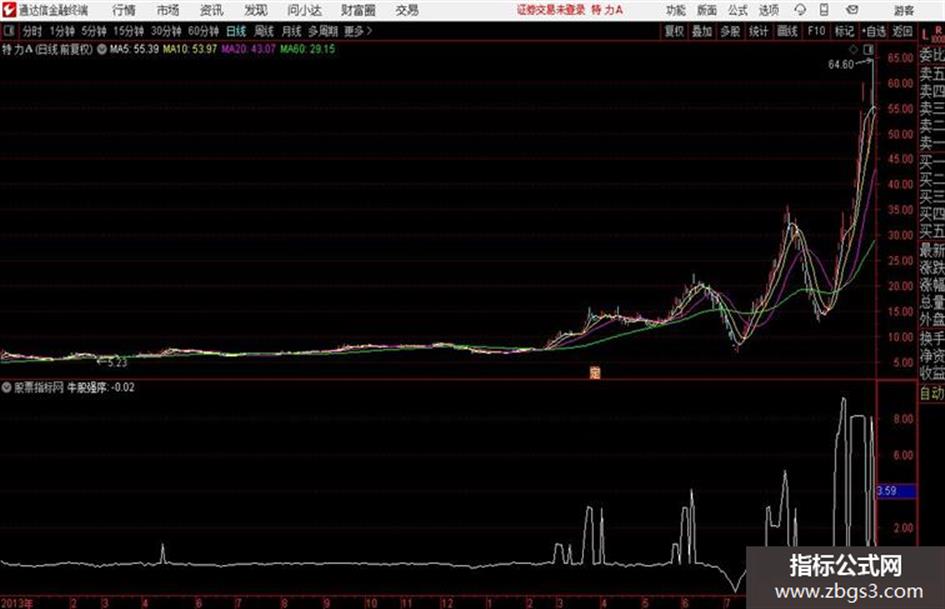 M1:=(-( HHV(EMA(C,5),14)-C)/C*5000);M2:=(CLOSE+LOW+3*OPEN+HIGH)/6;M3:=(20*M2+19*REF(M2,1)+18*REF(M2,2)+17*REF(M2,3)+16*REF(M2,4)+15*REF(M2,5)+14*REF(M2,6)+13*REF(M2,7)+12*REF(M2,8)+11*REF(M2,9)+10*REF(M2,10)+9*REF(M2,11)+8*REF(M2,12)+7*REF(M2,13)+6*REF(M2,14)+5*REF(M2,15)+4*REF(M2,16)+3*REF(M2,17)+2*REF(M2,18)+REF(M2,20))/210;M4:=MA(M3,6);M5:=(M3-M4)*1.2;M6:=(O*2+H+L)/4*10;M7:=EMA(M6,6)-EMA(M6,55);M8:=EMA(M7,6);M9:=(M7-M8)*0.06;M10:=M5+M9;M11:=M10>0;M12:=MA(O,3),COLORRED,LINETHICK;M13:=MA(O,13),COLORRED,LINETHICK;M14:=MA(O,34),COLORRED,LINETHICK;M15:=M12>=M13 AND M14>=REF(M14,1);M16:=EMA(O,12);M17:=EMA(O,50);M18:=M16-M17>0;M19:=C/REF(C,1)-1;M20:=IF(M15,2,0)+IF(M11,2,0)+IF(M18,2,0)+M19;M21:=(M20/10+M1/1000)*100+25,COLORWHITE;大百:=M21>100;FB:=(C/REF(C,1)>=1.097 AND C/REF(C,1)<=1.102) OR C/REF(C,1)>=1.1997;FBS:=COUNT(FB,10);QD:=(-( HHV(EMA(C,5),14)-C)/C*5000);牛股强序:IF(大百,FBS,0)+QD/5000;