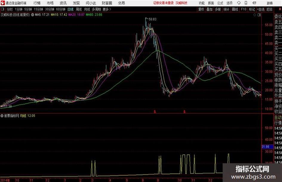 均线:IF(ZZ1=0,MA(C,TT),ZZ),COLORYELLOW;