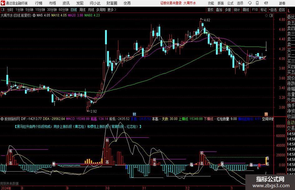 DRAWTEXT_FIX(1,0.05,0.04,0,'【黑马拉升由两个阶段构成:同步上涨阶段(黄芯柱)和惯性上涨阶段(背离阶段、红芯柱)】'),COLORFFFF00;