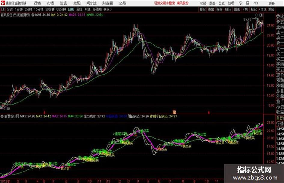 MA1:MA(CLOSE,5),LINETHICK1,COLORWHITE;MA2:MA(CLOSE,10),LINETHICK1,COLORYELLOW;MA3:MA(CLOSE,20),LINETHICK3,COLORMAGENTA;MA4:MA(CLOSE,60),LINETHICK1,COLORGREEN;买线:=EMA(C,4);卖线:=EMA(SLOPE(C,20)*10+C,35);DRAWTEXT(CROSS(买线,卖线),LOW*1.00,'↖买'),COLORRED,LINETHICK2;DRAWTEXT(CROSS(卖线,买线),HIGH*1.01,'↙卖'),COLORGREEN;LC:=REF(CLOSE,1);RSI:=SMA(MAX(CLOSE-LC,0),6,1)/SMA(ABS(CLOSE-LC),6,1)*100;DRAWTEXT(CROSS(90,RSI) , HIGH*1.01,'↙逢高出局!'),COLOR00FF00 ;A:=(3*C+L+O+H)/6;X:=(20*A+19*REF(A,1)+18*REF(A,2)+17*REF(A,3)+16*REF(A,4)+15*REF(A,5)+14*REF(A,6)+13*REF(A,7)+12*REF(A,8)+11*REF(A,9)+10*REF(A,10)+9*REF(A,11)+8*REF(A,12)+7*REF(A,13)+6*REF(A,14)+5*REF(A,15)+4*REF(A,16)+3*REF(A,17)+2*REF(A,18)+REF(A,20))/210;主力成本:EMA(X,13),COLORFF00FF,LINETHICK0;ZZ:=(O+H+L)/3;YC:=(H+L)/2;YCHJX:=(EMA(ZZ,4))+(YC-REF(ZZ,3))/4;今日买点:EMA(ZZ,3),COLORYELLOW,LINETHICK0; 明日买点:YCHJX,LINETHICK0;昨测今日买点:REF(YCHJX,1),LINETHICK0;FF:=EMA(CLOSE,3);MA15:=EMA(CLOSE,21);DRAWTEXT(CROSS(MA15,FF),(HIGH * 1.02),'↙拐点卖'),COLOR00FF00;DRAWTEXT(CROSS(FF,MA3),(LOW * 0.97),'↖拐点买'),COLOR00FFFF;