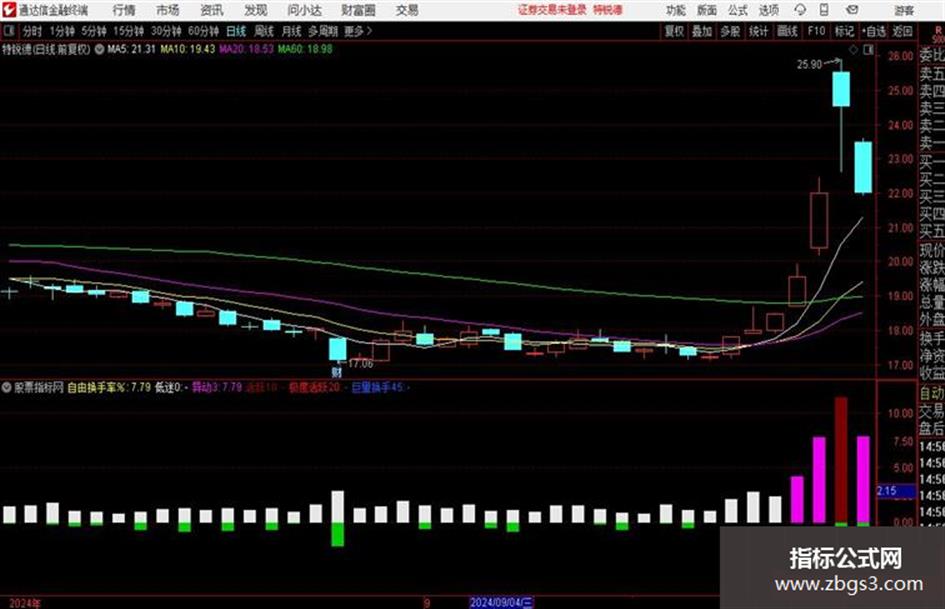 异动3:IF(自由换手率%>3 AND 自由换手率%<=10,自由换手率%,DRAWNULL),COLORMAGENTA,NODRAW;