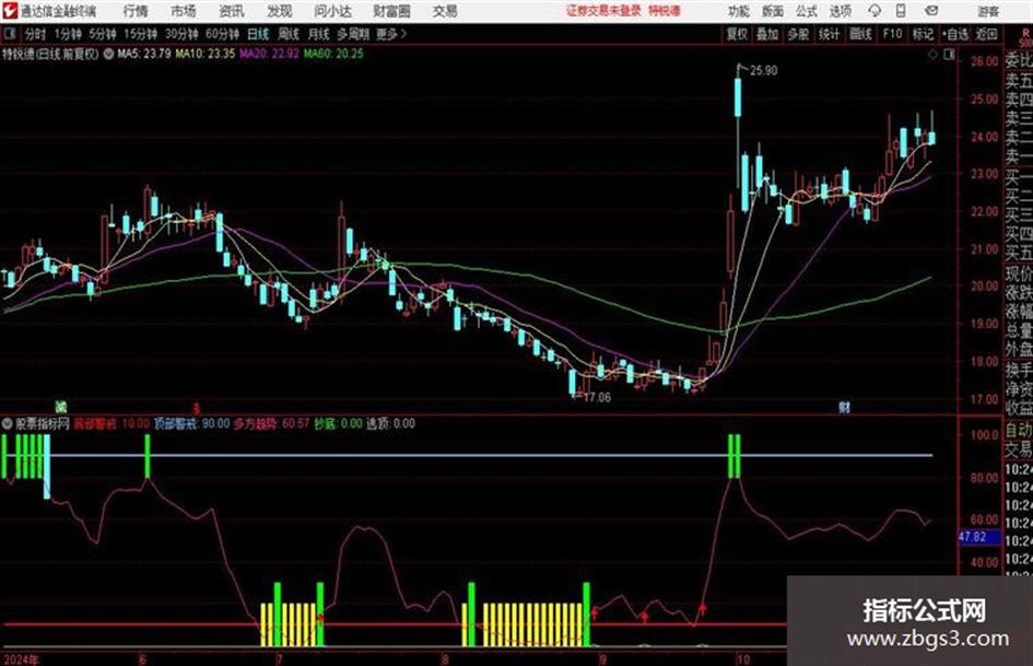 买入信号:STICKLINE(CROSS(股价趋势,10),0,30,3,0),COLORGREEN,LINETHICK5;